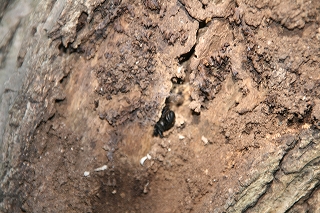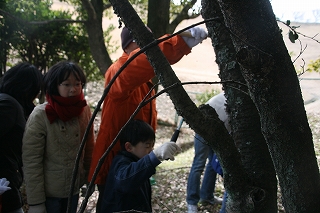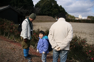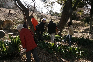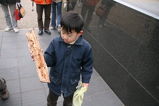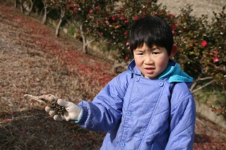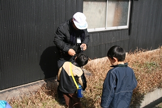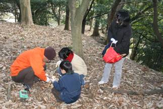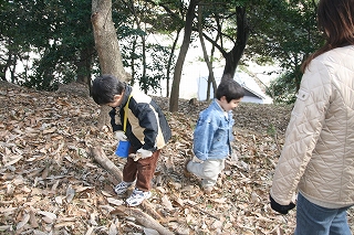 寒さも.ものともせず参加された昆虫少年の三家族の皆さんに観察路、注意点説明後、館・南西の樹林に向かいました。途上,休憩ベンチの朽ちた脚部を発見、館スタッフの了解の基に丁寧に子供さん達と裏返したところ,一目でカブトと判るやや小ぶりの幼虫の姿に大きな歓声が上がりました。そこではカブト、クワガタ、カミキリの各幼虫夫々、朽木の食餌が異なることを学びました。またアオスジアゲハの好むタブノキの横に植えられた佐布里ウメの木に付いた地衣類が外気清浄度の環境指標となるとの説明も受けました。帰路,ホトケノザの可憐な実を少しだけ頂き,館に戻った子供さん達の感想は「家の近くにいない幼虫が沢山観られた」、「アリさんが木の中で冬眠するのを始めて見たよ。卵もあった」、「寒かったけど虫達に会えてよかった」等でした(小川/記)。