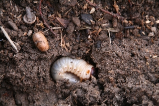 【左】コナラのベンチ下のカブトムシの幼虫