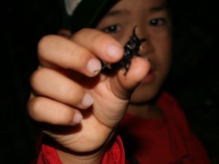 最近、ホタルに人気があり、たくさんの申し込みがありましたが雨が激しく降っていたので参加者は3家族で9名でした。雨の中参加するだけあって雨にもめげず早く外に出てみたい雰囲気で満ちていました。近くの雑木林を見に行くか打診したところ参加者の目が輝き出かけることにしました。雨がしたたる樹皮を懐中電灯で照らしました。ヒラタクワガタ、コカブトムシ、キマワリ、ムカデ、ナメクジを見つけました。特に、ナメクジがたくさん出ていました。