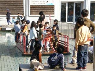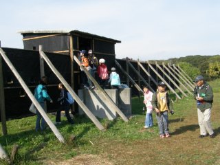 【左】 池のそばに設置されたブラインドを覗く 【右】農業文化園を見学