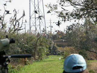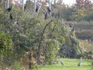 まず、愛知県の施設である「弥富野鳥園に行きました。野鳥園内の普段一般開放されていないカワウの営巣地に行きました。カワウがたくさん枯れ木に止まっているのがたくさん観察でき、近くに行ったら地面に白い糞がたくさん着いていました。糞の匂いはカワウが食べている魚の腐った匂いがしていたのが印象的でした。