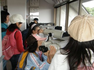 【左】弥冨野鳥園展望室の双眼鏡で観察