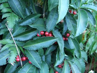 【左】日長神社のモミジの紅葉  【右】縁起植物のマンリョウ