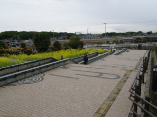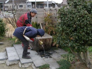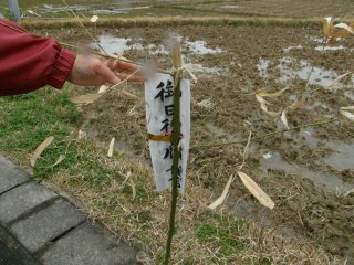【左】遊歩道にある水琴窟(すいきんくつ)に水を注ぎ音を聞いています。 【右】厄除けのお札が水田の縁にありました。