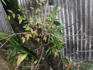 【左】カキノキにナンテンとノキシノブが着生していました。