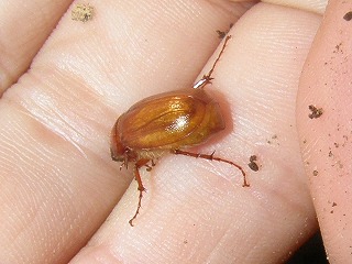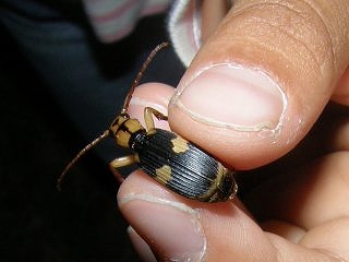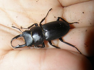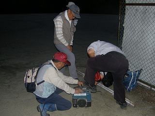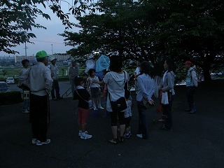 晴れて暖かく、夜間観察として好天に恵まれた。18:20大同グランドに到着、小島さんと灯火装置を例年のようにバックネットを利用してグランド北西に設置した。19:00旭公園北Pに集合し、挨拶、コース、注意事項説明のあと、指導員の自己紹介をして霜鳥さんの先導で大同グランドに19:20に到着した。灯火に虫が集まるまで、いつものようにナイトハイクを行った。降幡さんからミイデラゴミムシやモリチャバネゴキブリの説明を聞きながら東の水田へ移動した。夏至も近く、19;30はまだ明るい。必死にヘイケボタルを探したが案の定まったく見つからない。20:00近くなって暗くなり、やっと一匹見つかってからは、ぱらぱら見られるようになりほっとした。採っていけないのがルールだが、寂しそうに眺めているのを見かねて女の子に一匹採るのを許した。虫かごで光るホタルを見て、家族全員大喜び、ホタルの歌の合唱までおきた。採るのは良くないとわかっていても、考えさせられる思いがした。灯火観察場所へ戻る途中の茂みのクヌギで待望のコクワガタやキマダラカミキリも見つかりナイトハイクはさらに盛り上がった。一方、灯火のほうは去年に続いて虫が少なく、ガはそこそこ見られたが、コガネムシの仲間はセマダラコガネ1種類が来ただけでがっかり、常連さんのアオドウガネは2年続けて見られず、何か異変が起きているのだろうか。集まった虫の説明をして20:30きっかりに観察会を終了した。(記・平松俊)