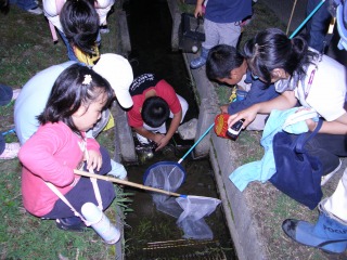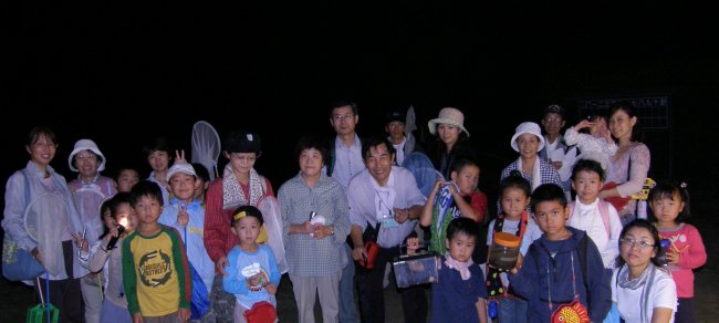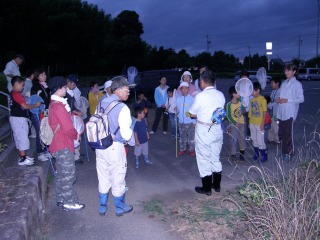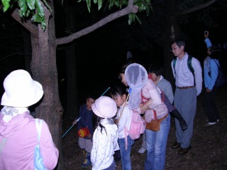 午後7:00過ぎ、降幡会長の先導で旭公園を横切ってコナラ、アラカシ、スダジイなどの林の中を虫を探しながら大同グランドに向かいました。穴だらけのアラカシの幹には根元から50cmくらいのところに大きなムカデがトグロを巻き(?)、2mぐらいの高さにはカナブンが集まっていました。ちびっ子たちは頭上のカナブンを捕らえようと手網を伸ばして木の周りをぐるぐる回ります。会員は、はらはらして「ムカデ」「ムカデ」と叫び続けました。公園の東の道路を横切って大同グランドに移動してバックネットに設置された灯火装置(白布を広げて電灯を照射し、虫を集める装置・・・・電源のないところでは発電機を用意しなくてはならないので大変です)をちょっとのぞいて(虫はまだあまり集まっていないので、最後はここに戻ることを知らせるために)グランドを横切り、東の林の中へ入りました。林内は暗く、足元は傾斜があって滑りやすく、段差や倒木もあってちびっ子たちにはちょっとした冒険気分になったものと思われます。林を抜けたところの繁みにクロマドボタルが光っているのを発見し、全員が交代して観察していると、水田のほうから「ホタルが飛んだぞー」の声が聞こえてきたので水田のほうに移動しました。もうヘイケボタルの最盛期は過ぎているのでほんのわずかでしたが茂みや水田の稲で光っているホタルを見ることができました。帰りは広い道路に出て虫を探しながらグランドに戻りました。