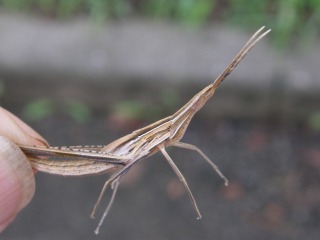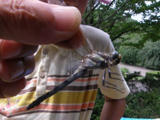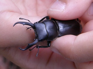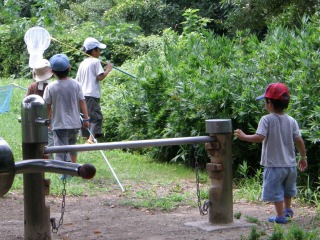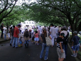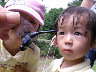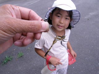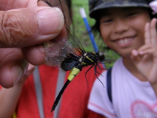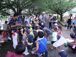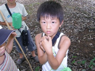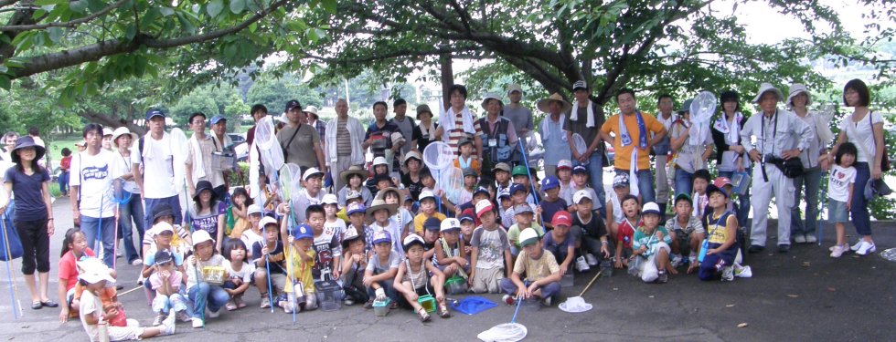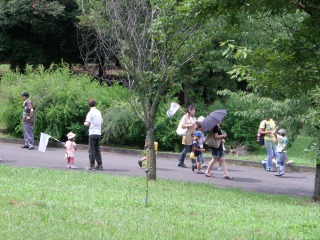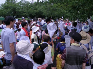 駐車場に車が一杯。集合場所は人が溢れている。何かの集会とかち合ってしまったのでは?と思いきや、なんと自然調査隊に350名以上もの参加者。自然観察会で初めてのことが起こりました。環境政策課の方が、市の広報や、市内の全小学校へ、チラシで案内をして下さったお陰です。うれしい悲鳴!観察会のために用意したプリントは間に合いません。急遽グループ分けをして、昆虫を中心に観察会を行うことにしました。子供の頃に、図鑑ではなく、自分の手で虫を捕らえたり、植物に触れたりしてこそ、興味や関心が湧くものです。広報を見て、参加された大人の方も、子供の付添の親さんも大変熱心で、和気藹々と観察することが出来ました。お目当ては、カブトムシやクワガタムシという子が多く、はりきっていました。名古屋からの参加者もいました。カブトムシやクワガタムシの見つかりにくい時間ですが、願いが叶い、幸運にも手にすることができた子がいます。雨上がりで、セミ、トンボ、チョウ、バッタ、カエル等が沢山いて、全員が生き物を捕らえることができました。この観察会が、自然を見る目が広がるきっかけ、となって欲しいものです。(記:吉房)