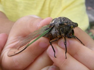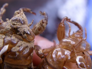【中】左クマゼミ、右アブラゼミ(ショッカクに注、クマゼミの方が土がたくさん付いている)