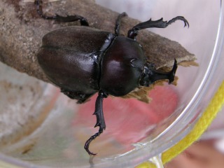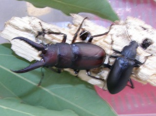 【左】カブトムシ♂ 【右】ノコギリクワガタ♂とユミアシゴミムシ(右)