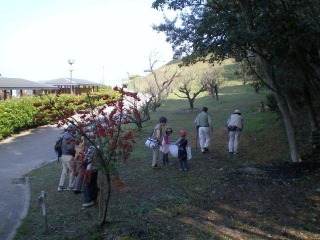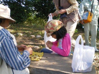 一般の参加者は母親と子供2人の1家族だけで会員のほうが多い観察会となりました。赤く色づいたピラカンサの実やヒトツバタゴの黒い実を観察したり、サザンカやツバキの種子や殻、ナンキンハゼの白くはじけた実などを拾いながら林の中を散策しました。楠や椎の木の林の中で木の幹をキャンバスにして落ち葉や木の実や枝などをご飯粒で張り付けて絵を描きました。椎の実がたくさん落ちていたので子供達にも生のまま噛んで割って味わってもらいました。最初はなかなか割れなかったのですが、要領がわかって割れるようになりました。