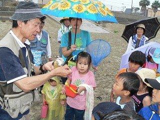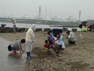 はじめに、安全のための話をする。次に歩きながら貝殻拾いをする。集められたのはイソシジミ、サルボウ、シオフキ、アサリ、アカニシ、ツメタガイ、アラムシロガイ、ナミマガシワ、ホトトギスガイ、クチバガイ、マガキ、それと小石についたシロスジフジツボや海藻のアナアオサも拾われた。砂の上をよく見ると、小さなヒメハマトビムシを見ることができた。存在は小さくても数が膨大で、海の掃除屋さんとしての力は大きい。波打ち際の小石混じりのところを掘ると、クチバガイがたくさん出てきたので、食べれるかなあということも話題とされた。しだいに、子供たちは石垣の堤防のすきまにいるカニをとるのに夢中になった。雨なんか、塩水なんか平気で歓声を上げていた。採れたカニは、カクベンケイガニとケフサイソガニのなかまであった。脱皮中のカニや、はさみ脚の折れたり、折れた脚が再生してくる途中のものが観察できてよかった。(記・中井(康))
