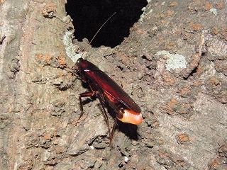 【中】クロゴキブリ?雌(卵鞘があるので雌で、ヤマトゴキブリの雌は羽が短いのでクロゴキブリと思われます。クロゴキブリは屋内にしかすまないと思っていましたが、もともと野外に住む外来種でヤマトゴキブリを屋外に追い出したのだそうです)
