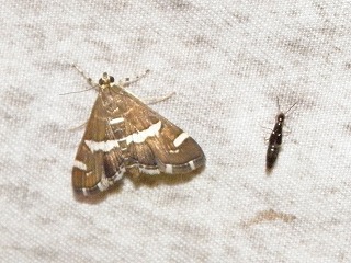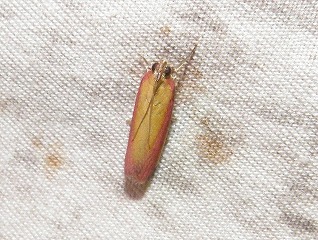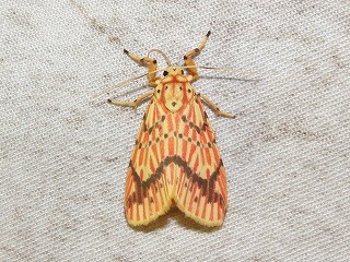 【左】水銀灯で虫集め 【右】スジベニコケガ