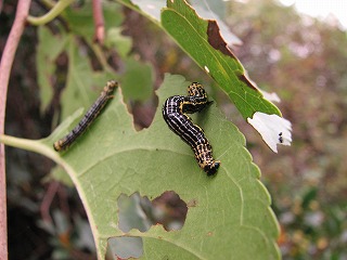 【左】ツルウメモドキの実   【右】同左の葉にトンボエダシャク(ヒロオビ…?)