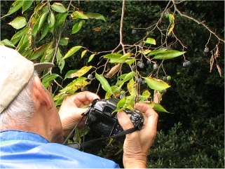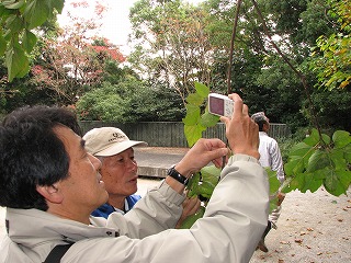 【左】古川氏宅産のオニグルミを生で試食  【右】ツルウメモドキの前で観察談義
