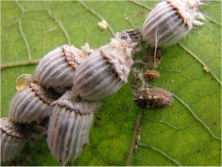【左】コナラのどんぐりを拾う   【右】イセリヤカイガラムシ♀(中央右=幼虫)
