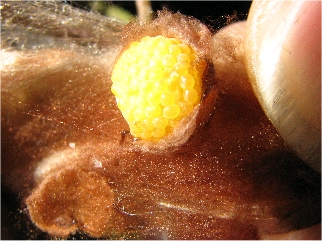 繭の中に、さらに繭。その中に、きれいな黄色の卵がしっかりと入っていました。クモの名は…分かりません