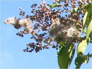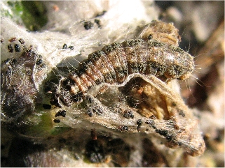 【左】トウオガタマモチに付く虫の巣 【右】巣の中にはこのような虫がいっぱい(大きさは5mm前後)
