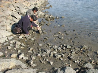【左】阿久比川。向こう岸が遠いので普通のカメラでは使い物になりません     【右】石の下の生きもの探し