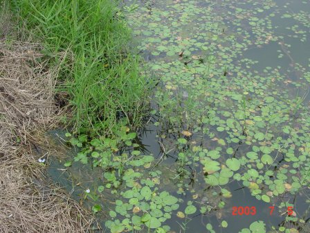 【左】比較的浅いところに生えるガガブタ。池の改修などで、知多半島の池では、見られるところは大変少なくなりました。