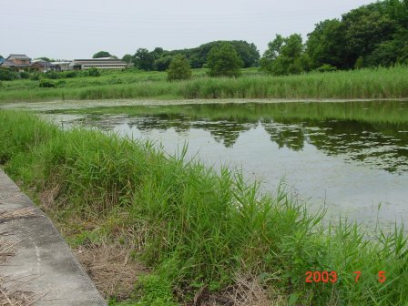【右】明覚池の景観。周りに水草や樹木が生えた環境が良い池です。