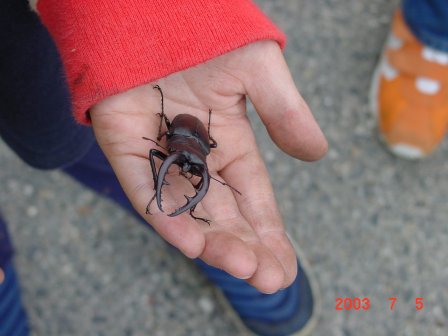 このように環境が良い池ですが、今年はトンボが少なく、見られたのはせいぜい5〜6種でした。物足りなかったので、西側のコナラ林に移動しました。林の中でヤブカの攻撃に会いましたがカブトムシ、ノコギリクワガタ、コクワガタ、カンブンを何頭か採集することができました。子供たち大喜びでした。