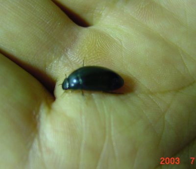 【右】ヒメガムシ。水生植物が多い田池沼などに生息し、幼虫は巻き貝以外にもアカムシ、メダカなども食べます。