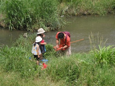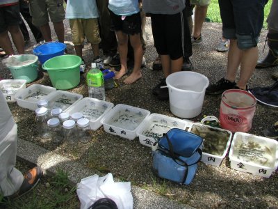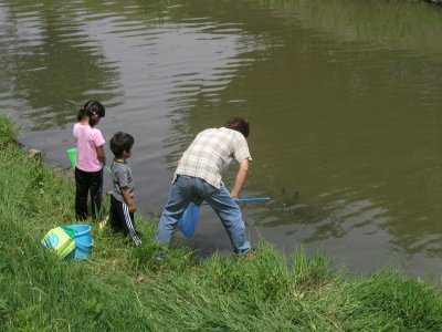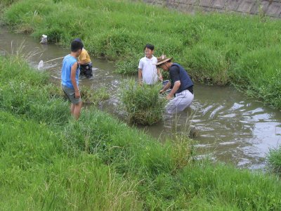 川底の様子は変化に激しく、川底ブロックの前で特に深くなりやすいようだった。大人の背でも急に胸まで入ってしまうなど、親がついているとはいえ、安全面での注意がより必要になってくると思われた。草の生えているところは比較的浅いが、浅いがゆえに今度は泥で脱出できなくなりそうなところもあり、本当に『変化に激しい』川だった。が、魚たちにとっては激しすぎて住みにくくなったのか、数年前から確実に魚の種類が減ってきている。特に河川改修をしてからの減り方が激しいと金内さん。昨年1匹見られたモツゴも今年は1匹も見られないと田中さん。