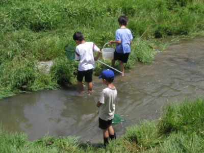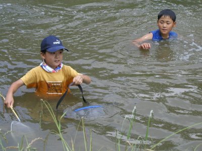 【左】さあ,親子入り乱れて魚採りです。手前が深いです。