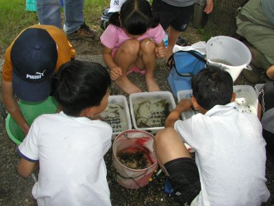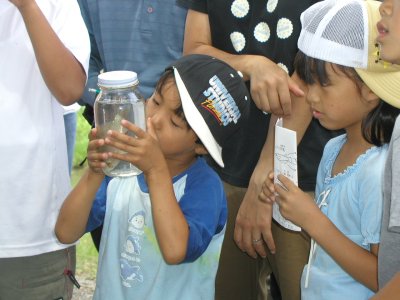 台風が近づいて雲の動きが激しく、ぎらぎら太陽が輝いたかと思うと今にもふりそうな暗い雲になったり落ち着かない天気だった。が、水に入ってしまえばそんなことはどこへやら、大人も子供も目を輝かせて たもを振り回していた。親子連れ(お父さんも一緒)の参加者が多かった。はじめはおっかなびっくりだった子供たちも、親のたもの使い方を見よう見真似で習得して、草陰を足で踏むなどめきめき「たも名人」になっていった。だれか、河童になりきって泳いでいる子もいて、周りから「いいねえ。でも水だけは飲むな!」と声がかかっていた。エコマップの関係者の方も参加されていた。ネイチュア・フィーリングではないが、車椅子の方でデジカメを足を使って撮影しておられるのを見て、そういう参加の仕方もあるのだなと少しびっくりした。