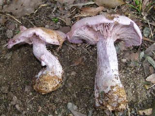 【左】ムラサキシメジ(食)。落ち葉の中にたくさん生えていることがあります。