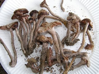 【右】ウスキモリノカサ(食)。少し古くなった物を食べると胞子の色が出て料理が黒くなる。