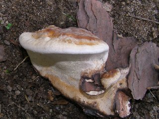 【左】ツガサルノコシカケ?。枯れたマツに発生していました。