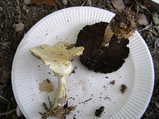 【左】クロハツ(食)。切り口が赤い色になりその後黒くなりました。