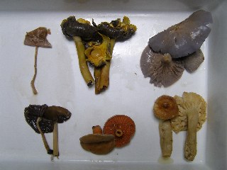 【左】試食したキノコ。左上からウラベニガサ、ウスキモリノカサ、ムラサキシメジ。下左からイタチタケ、アカハツ、カワリハツ。
