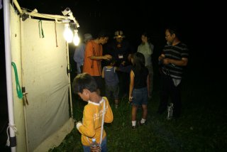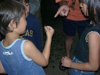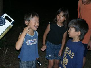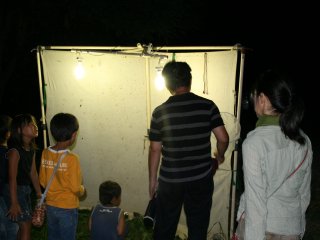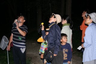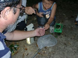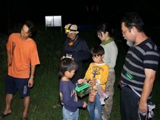水野先生の分かりやすくおもしろい話に保護者も「へぇー。なるほど。」と、感心しきり。もちろん子どもたちは、話だけでなく初めはセミさえ持つのがこわごわだったのに、帰るころには自分から手を出して捕まえられるようになっていった。家に持って帰らない虫は観察後どうするかという話を子どもたちがしているのに「逃がしてやるときは、下に逃がしてやれよ、投げると傷が付くから。」とアドバイスし合っていた。燈火採集は、アオドウガネやカメムシ類が少し集まっていた。観察会終了後子どもたちはセミの幼虫やセミをうれしそうに持ち帰っていった。(記 春日 竹内)