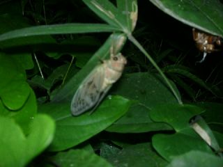 【右】ほら、全然こわくないよ、セミの羽は扇風機みたい。
