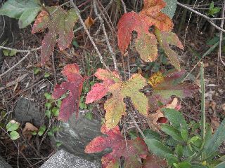 今日の一般参加者はなし、身内でゆっくりさんさくした。東浦高校まえの富士見台は道路拡張のため削られて「あの」イスノキやサザンカ、わらびのおかはごっそり無くなり、コマツナギやヨウシュヤマゴボウがはえるのっぺらとした斜面になっていた。気のせいかマツが元気になっていた。もとのようになるまでに何年かかるかねえ。というつぶやきに、わたしらが生きている間にはもどらんね。の声。にわか作りの道路と土手にフェンスの土台がすでに傾き始めていたのを発見。田畑の周りを回りながらセンブリの花を目指す。少し奥に入るにつれ以前は耕されていたところが草某々になり農地の荒廃を少しではあるが感じた。シャシャンボの実は少し早くて味わえず残念だった。カラスウリの種にカマキリの顔を連想したり、アンモナイト型のアオツヅラフジの種を確認したりした。初めてアメリカヒメキンバイを東浦で見た。竹藪はどんどん広がり、中央部では枯れ株も増えていると感じた。センブリは大きな花を咲かせて健在だったが、周りはササ藪が生い茂り、以前は見られたノギランなども見られなかった。ノイバラのルビー色の実が目にまぶしかった。(記・竹内秀)