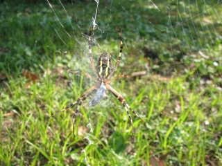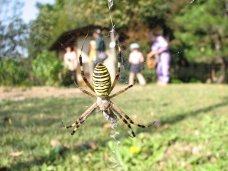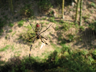 【左】ネムノキの種子を拾う 【中】頭上にはジョウロウグモがいっぱい 【右】足下にナガコガネグモがいました。バックの人影はハクウンボクの実を拾っているところ