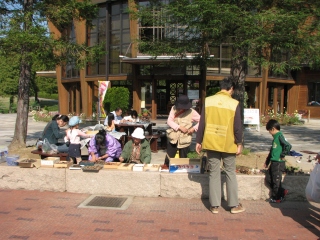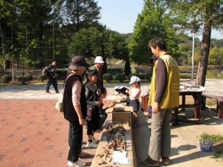ぽかぽか陽気で公園内の散歩の人も多い。天気の良さに机を外に出してひなたぼっこをしながら工作をすることにした。昨年にくらべて参加者は少なく、親子が1組でスタート。しかし、この子が種に興味のある子でドングリ以外のたねも喜んで拾っていた。種拾いに一生懸命になる姿が大変かわいくみんなが温かい気持ちになった。
