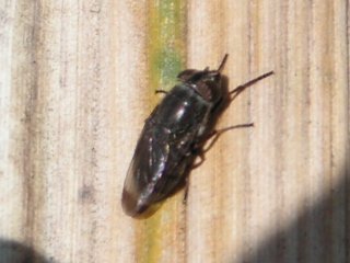 【中】オオクロバエ(木を貼り付けた土手の日当たりに止まっていました)