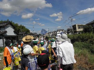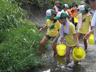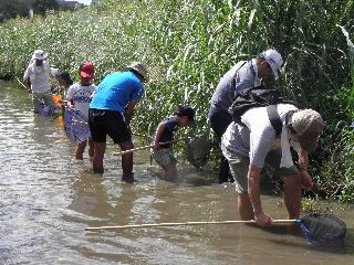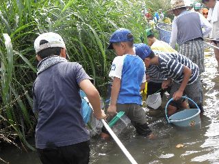 お盆に1度雨がふったっきり連日35度以上の猛暑続き。今日も朝から晴天。水分補給をして熱中症に気をつけるよう注意をして始めた。夏休み最後の週末に親子やイオングループの参加もあり盛況だった。午前中というのに空気は暑く、水の中にはいると気持ちいい感じ。晴天続きで川の水は少し少なめ。だが、深めのことろは子どもの股まで水が来ていた。始めに聞いた魚の取り方に気をつけて誰もが夢中になって,楽しんだ。