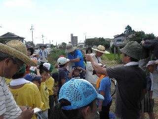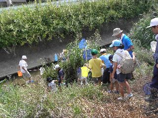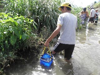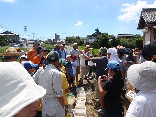 暑いので少し早めに水から上がり,タナゴ,二枚貝,ヨシノボリの共生などの話を聞いた。  須賀川での観察会は去年に引き続き2回目。昨年度より生き物の種類は少ないが、タイリクバラタナゴがたくさん見られた。今年の明徳寺川と比較すると生き物の数が多いと感じられた。フナがいくらか観察された。