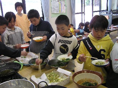 【右】子供達が列を作って料理を受け取りに来ました。