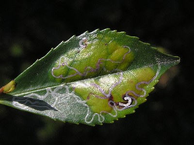 【右】ヒサカキに字書き虫が入っていました。(正体はハムリバエかハムリガ)