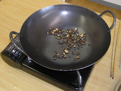 【右】タンポポコーヒーを作るためにタンポポの根を黒くなるまで炒ります。