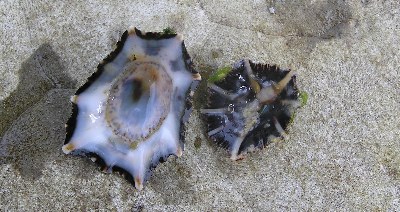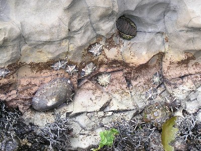 【左】カメノテ、ヒザラガイ、イボニシが岩についています。