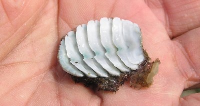 【右】ヒザラガイの貝殻です。8枚がばらばらになる前で、こんなのを見るのは珍しいです。