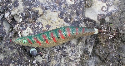 【右】変わった生き物を採集しました。よく見るとルアーでした。鋭い針が付いて大変危険なものです。